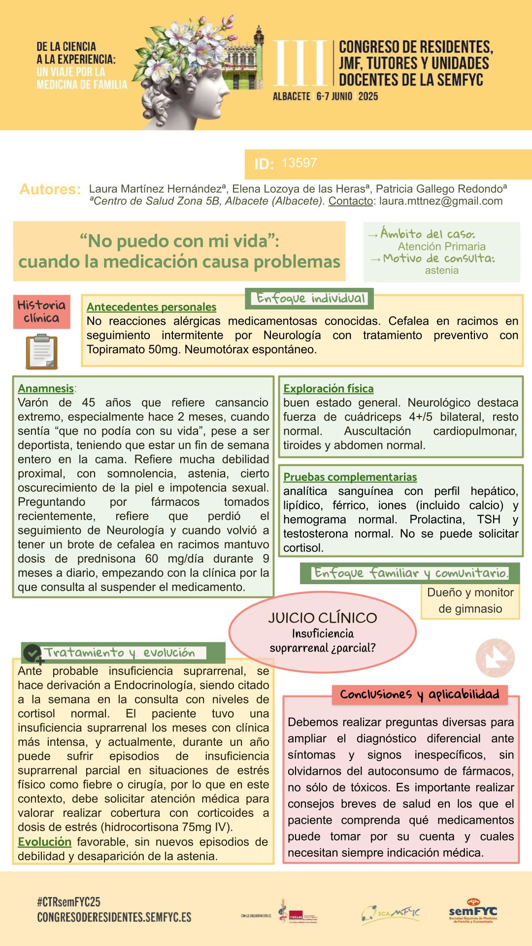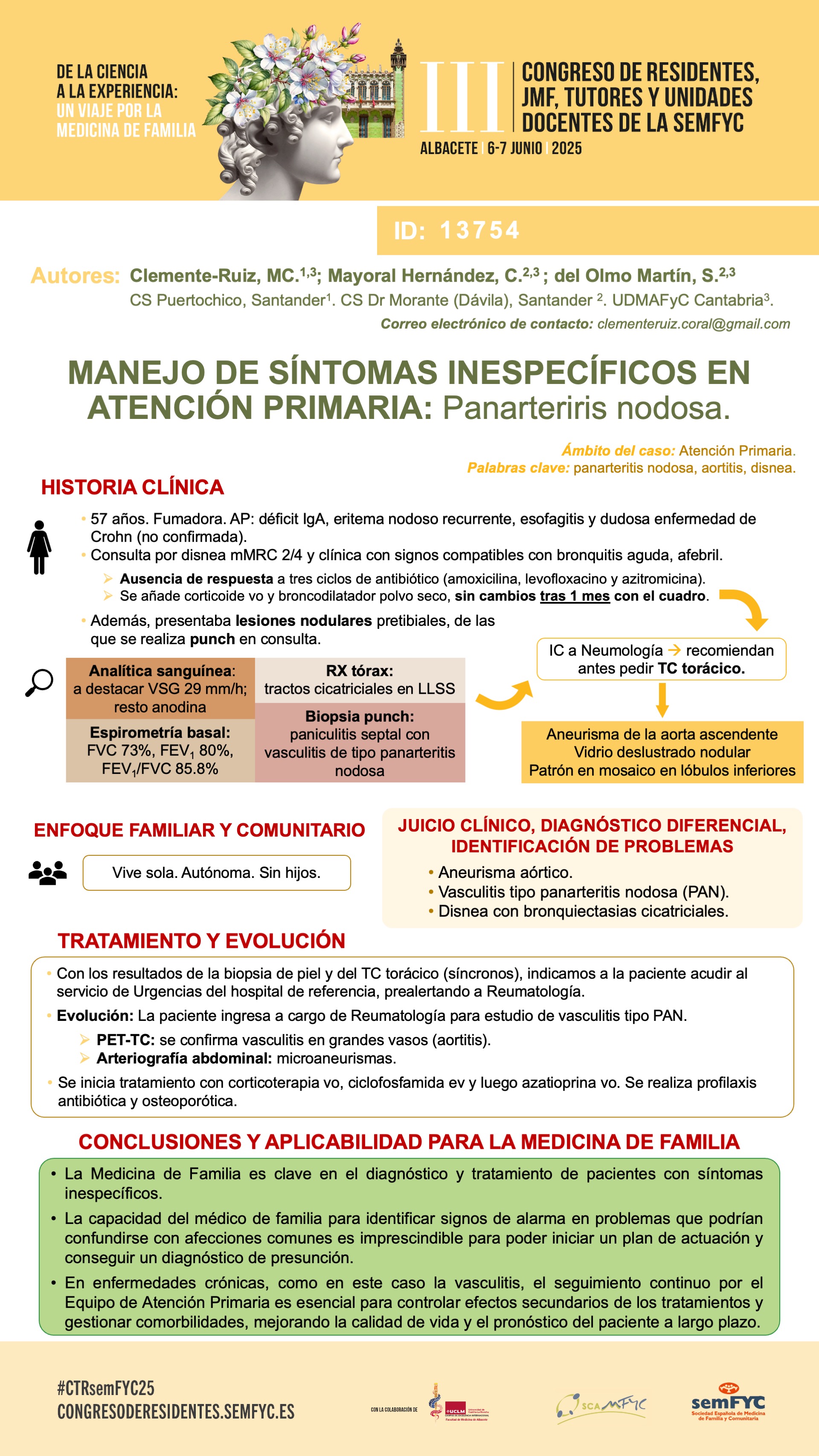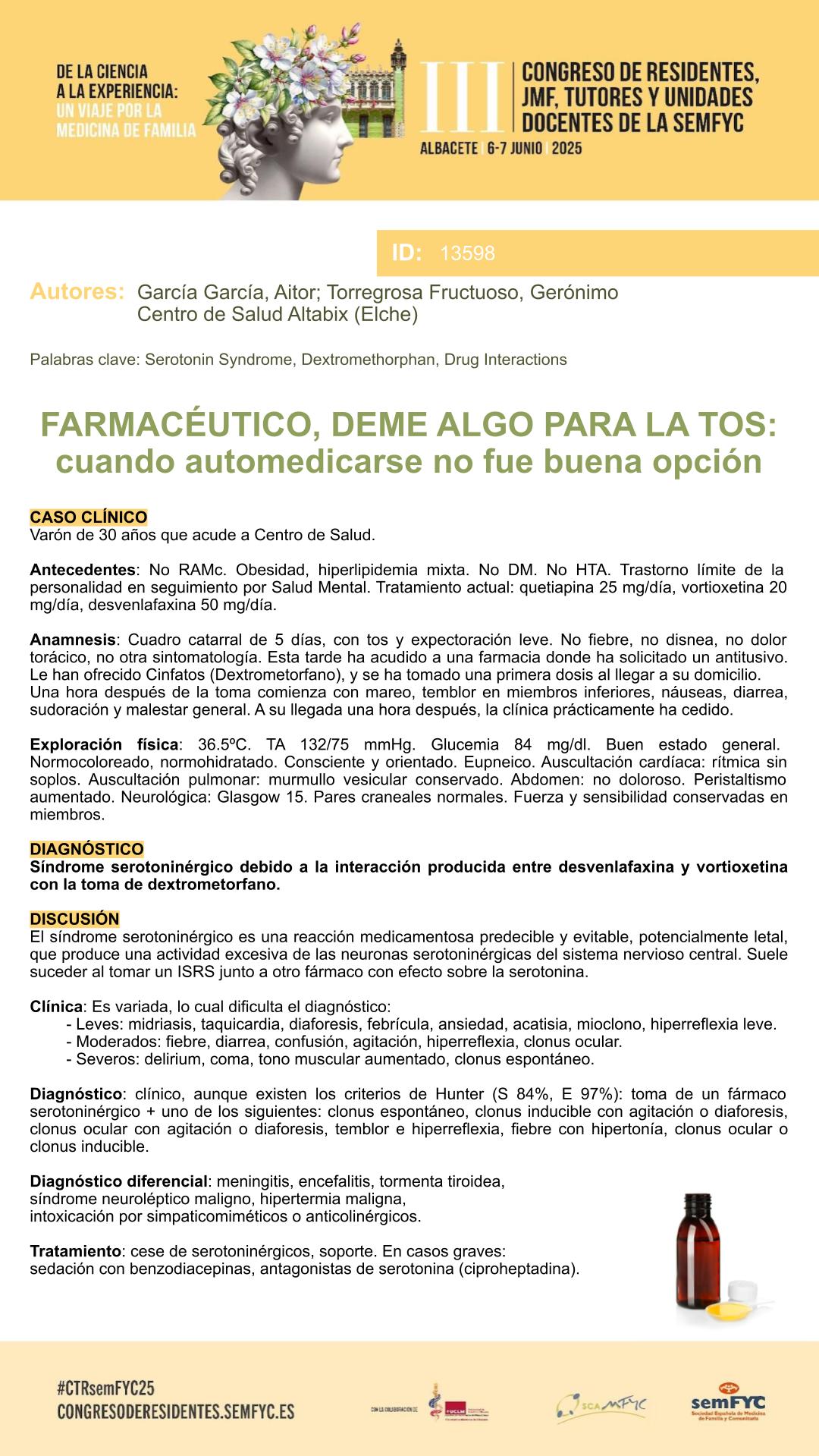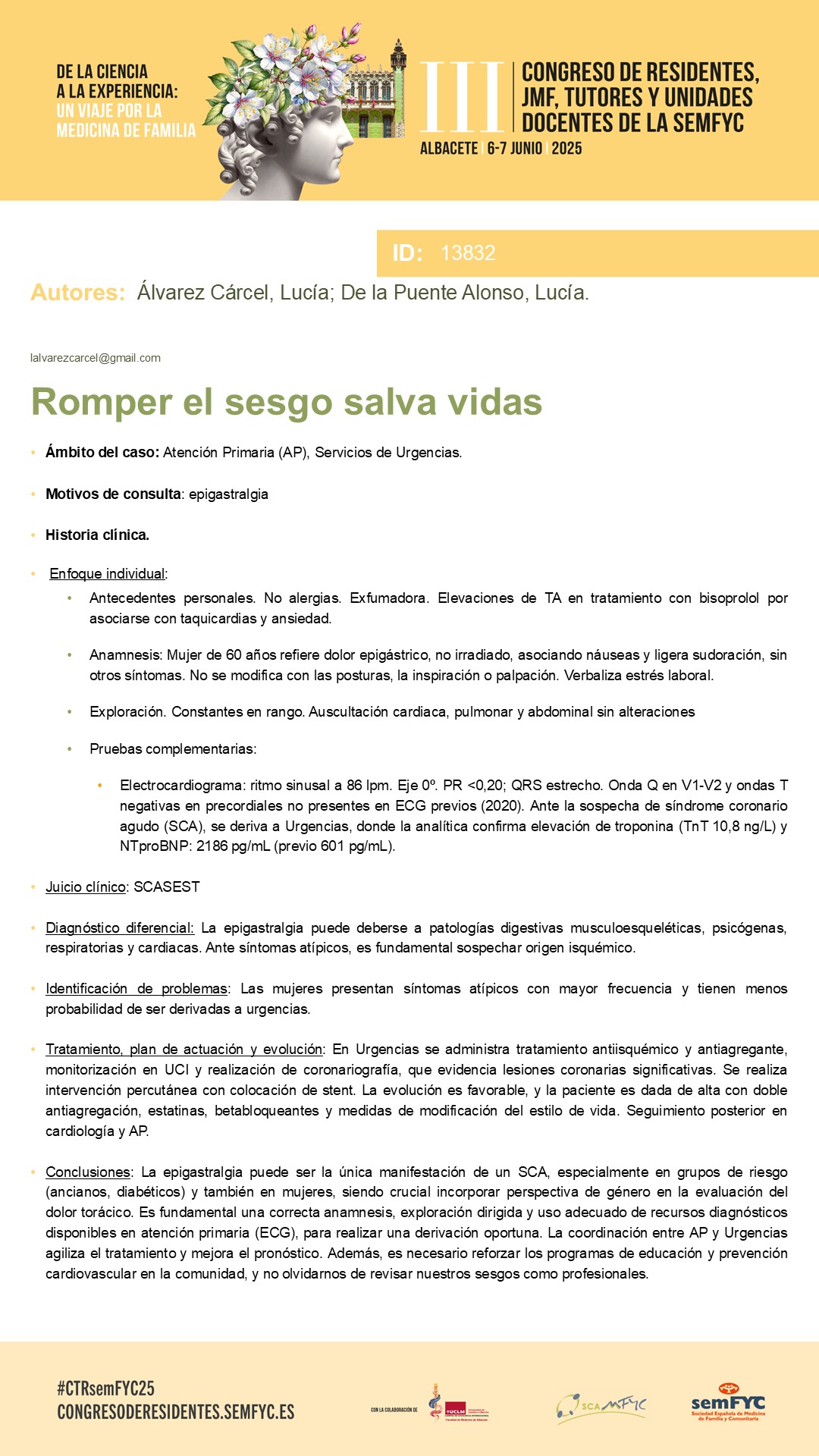 Vota el mejor el póster a través de la encuesta que encontrarás en la APP de la semFYC (Descargala aquí) Puedes votar desde el lunes 2 hasta el sábado 7 a las 12:00h. El premio al mejor póster se entregará el sábado 7 de junio en el acto de clausura del Congreso. |